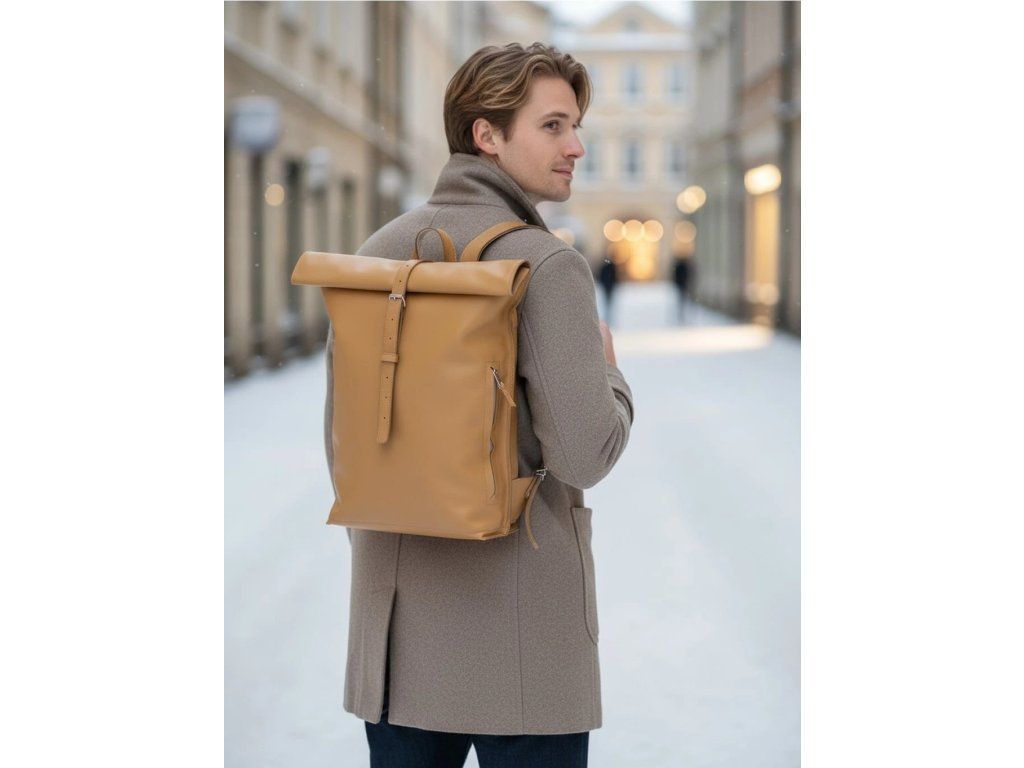 Moderní městský batoh s rolovací konstrukcí a řemínkovým zapínáním s kovovou sponou.