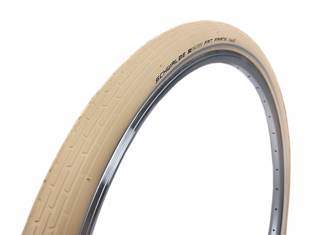 Krásný balónový plášť Schwalbe Fat Frank v celokrémové barvě s bílým reflexním proužkem a s šířkou pláště 50mm.