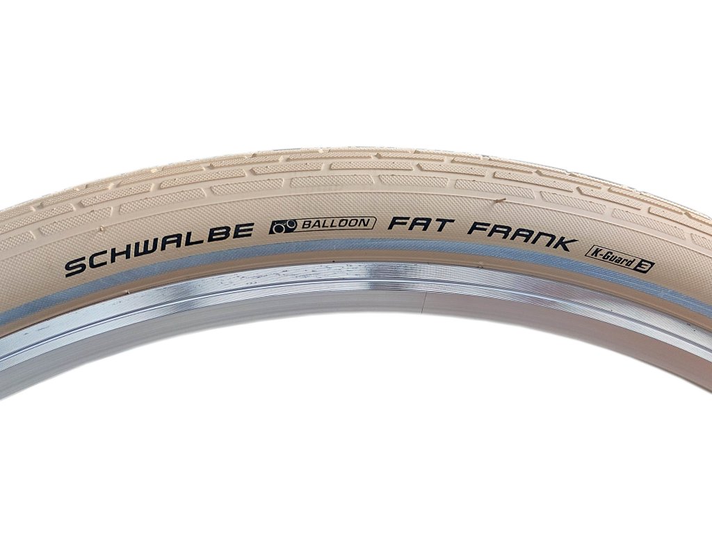 Krásný balónový plášť Schwalbe Fat Frank v celokrémové barvě s bílým reflexním proužkem a s šířkou pláště 50mm.