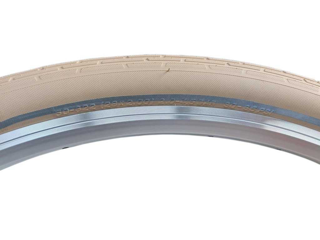 Plášť Schwalbe Fat Frank v celokrémové barvě s bílým reflexním proužkem a s šířkou pláště 50mm.